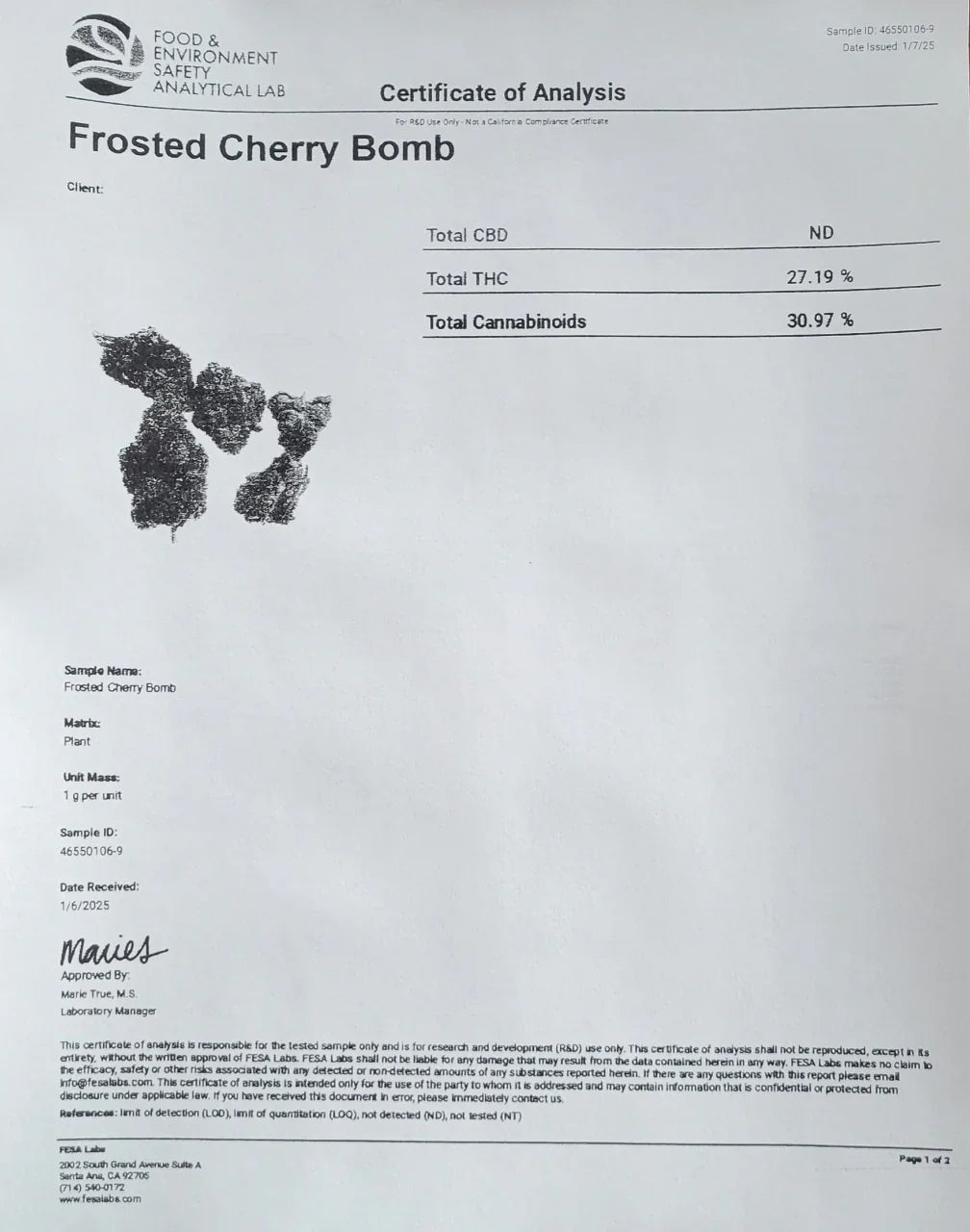 Frosted Cherry Bomb is a balanced 50/50 hybrid variant that crosses a California indica (most likely with Skunk lineage) and a Hawaiian sativa from the breeders at Barney’s Farms that offers the best of both worlds, presenting a perfect blend of cerebral stimulation and physical relaxation. its distinctive sweet cherry and berry flavor profile provides a charming sensory experience. Known for its therapeutic benefits, The strain’s unique combination of terpenes, including caryophyllene and limonene, contributes to its well-rounded effects.