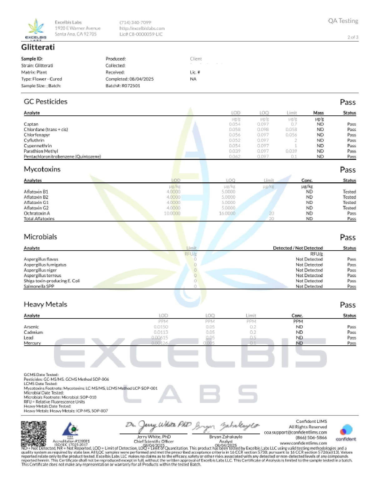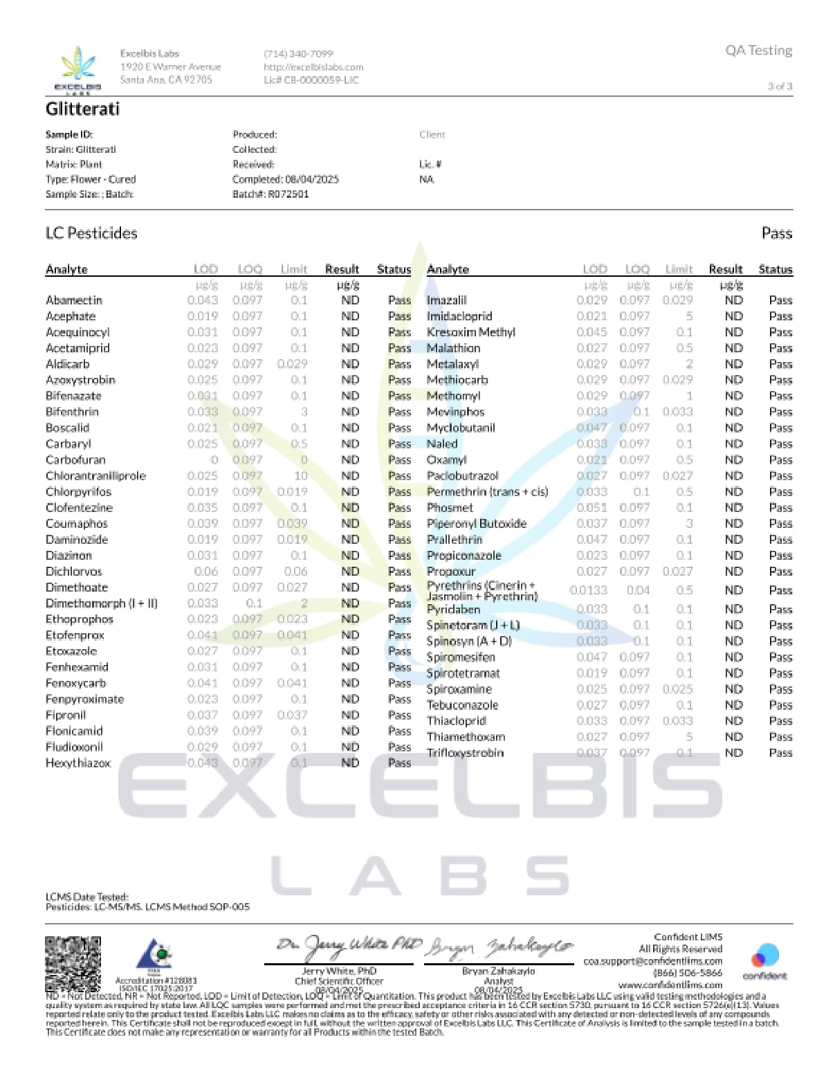 Glitterati is a slightly indica-dominant hybrid strain with a created by crossing Glitter Bomb and Gastro Pop strains. It is known for its visually striking appearance, featuring fluffy, fat, spade-shaped nugs with bright emerald-green coloration, deep amber undertones, vibrant orange hairs, and a frosty coating of chunky white trichomes. The strain emits a sweet, creamy vanilla aroma with sugary berry notes, and its flavor profile includes sweet vanilla, sugary berries, and a hint of fresh flowers.